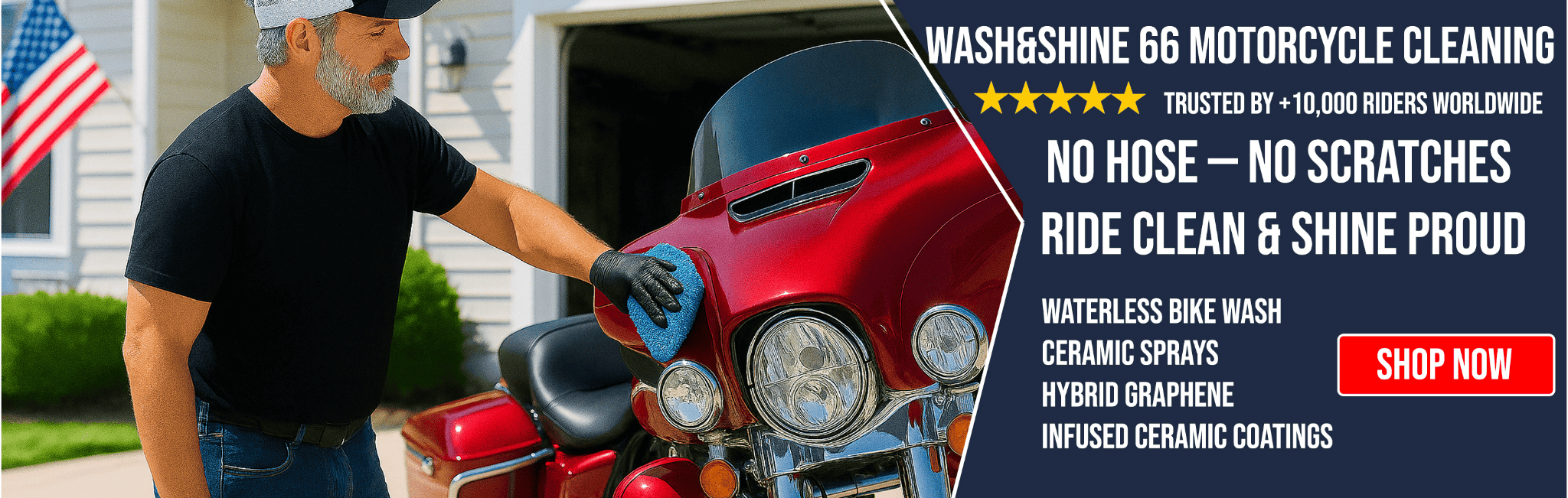 Today’s motorcycle care has evolved beyond soap, water, and buckets. Waterless motorcycle cleaners like Wash&Shine 66 use advanced nano-emulsion technology to encapsulate and lift dirt particles from paint and chrome without scratching. This method not only saves up to 150 gallons of water per wash but also leaves a deep, streak-free gloss finish in minutes. Ideal for Harley, Indian, or sportbike riders, waterless bike cleaning delivers a showroom shine wherever you park—no hose required.
